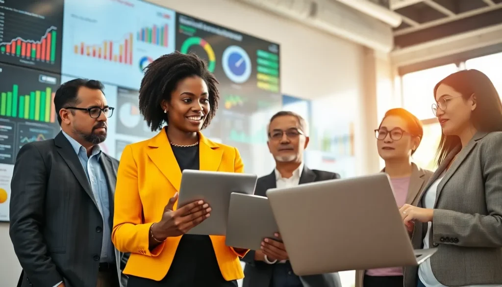 a diverse team analyzing industry trends in a modern office setting.